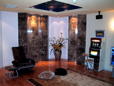 カ−ペットに横たわりながら、大型TVで映画鑑賞は