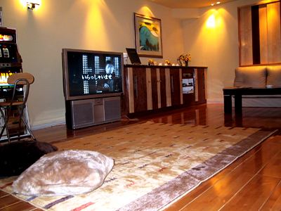 カ−ペットに横たわりながら、大型TVで映画鑑賞は
